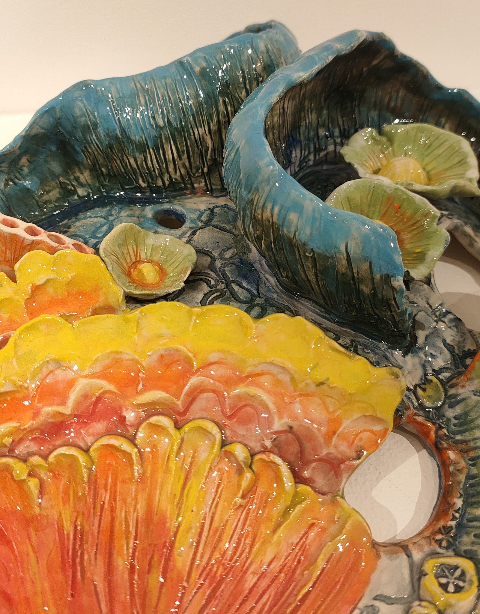 Materials: hand sculpted with stoneware clay. Delicate parts, underglaze with clear glaze over. Can add a wire or D ring to hang if you wish.
