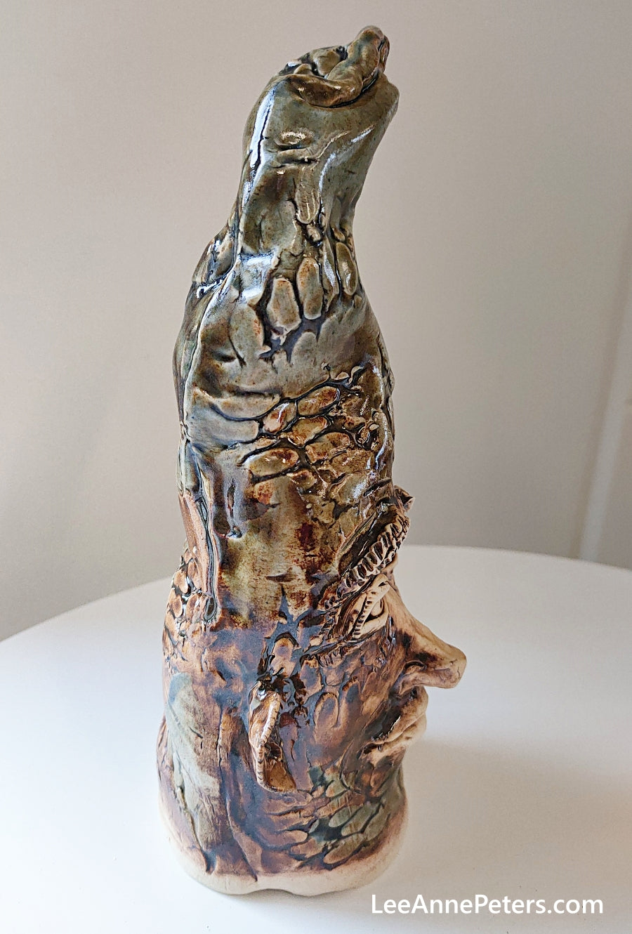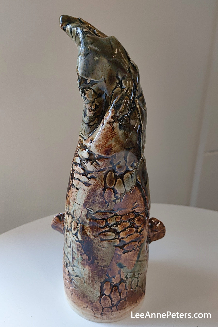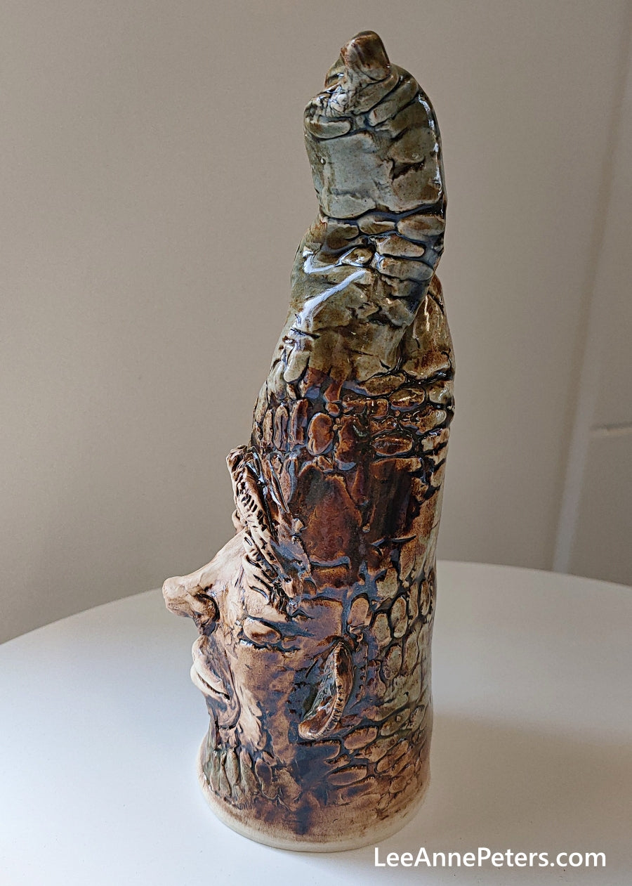 Materials: White stoneware clay hand glazed in a glossy chocolate and green glaze.
