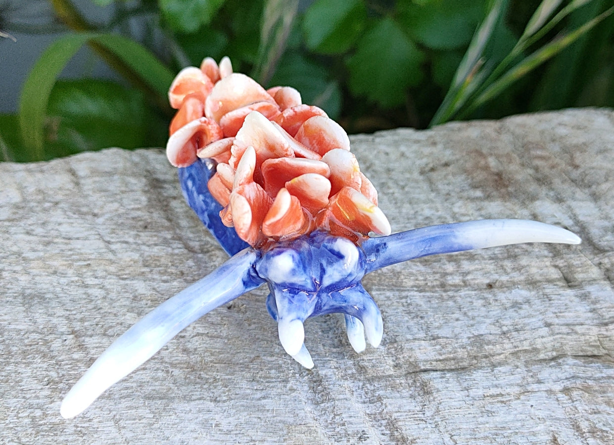 Materials: hand sculpted with porcelain. Underglazed and clear glaze over.